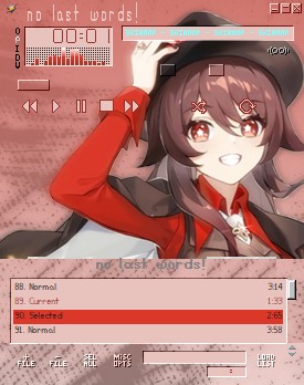 A quick test with a cute piece of official art of Hu Tao. Classic Winamp skins have an issue with repeating textures around the playlist title which is very... odd to work aroun, so I opted to set the playlist as just a colored texture. No equalizer here to really show off the character.